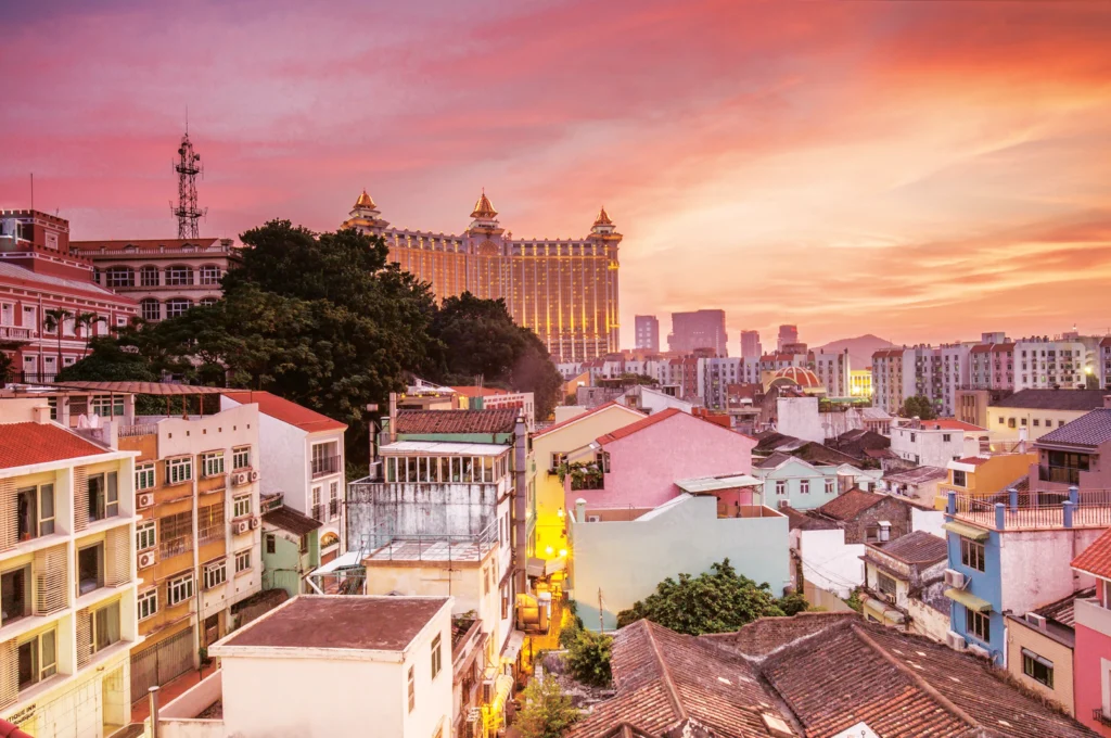 منازل قديمة تحافظ على الطراز المعماري البرتغالي التقليدي مع لمسات صينية.